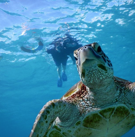 沖縄の慶良間諸島にある渡嘉敷島のとかしくビーチでウミガメと泳ぐ